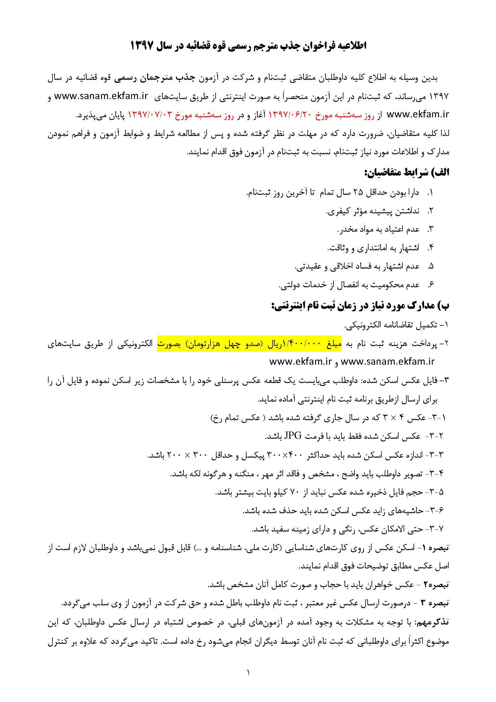 ثبت نام آزمون جذب مترجم رسمی كتبی قوه قضائیه سال 1397 آغاز شد. مهلت ثبت نام از تاریخ 20 شهریور لغایت 3 مهرماه 1397 می باشد
